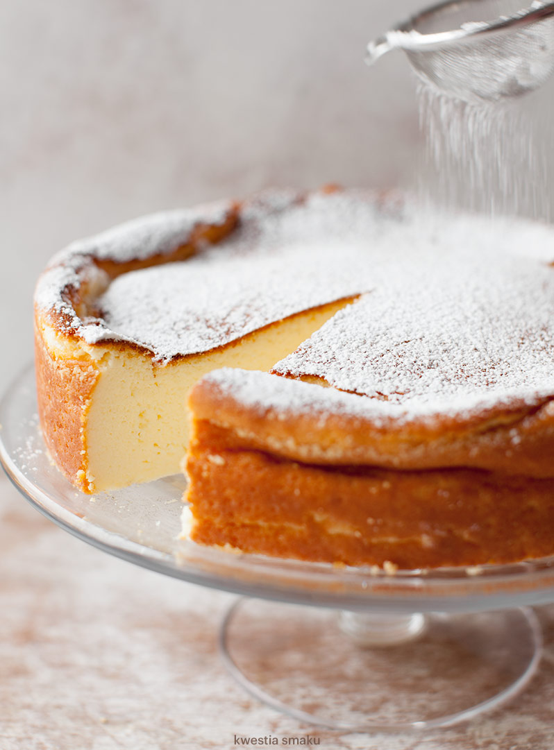 PRZYGOTOWANIEMiękkie masło ubić na puszysto, stopniowo dodawać po jednym żółtku na przemian z łyżką cukru pudru, cały czas dokładnie ubijając składniki. Zmniejszyć obroty miksera do średnich, dodać zmielony ser i połączyć. Teraz dodawać po kolei: cukier wanilinowy, śmietankę oraz mąkę ziemniaczaną cały czas miksując składniki na jednolitą masę. Na koniec wymieszać (delikatnie, ale dokładnie) z ubitymi na sztywno białkami. Przygotować tortownicę o średnicy minimum 26 cm (mierzona od środka). Posmarować ją masłem i wysypać bułką tartą lub mielonymi migdałami lub dno wyłożyć papierem do pieczenia. Masę serową wyłożyć do tortownicy i wstawić do piekarnika nagrzanego do 170 stopni C. Piec przez 60 minut. Sernik studzić stopniowo wyjmując z piekarnika (najpierw po trochu otwierając drzwiczki i lekko wysuwając sernik, w końcu wyjąć z piekarnika). Zrumieniony wierzch sernika posypać cukrem pudrem lub polać polewą czekoladową. |